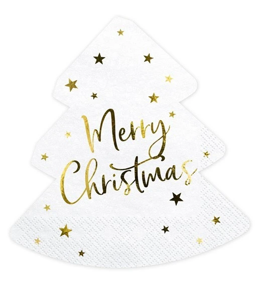 Ces serviettes en forme de sapin de Noël sont parfaites pour décorer votre table pendant les fêtes. Les serviettes blanches au design original de sapin de Noël sont imprimées de jolies étoiles et de l’inscription « Merry Christmas » en or métallique. Grâce à leur design discret mais tendance, elles s’intègrent parfaitement à toute décoration de Noël. Le lot contient 20 pièces de 30,5 x 32,5 cm.